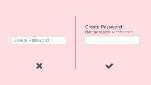 So for example, when asking someone to create a password, you should put clear guidelines next to the form field. It’s important to put it in a permanent spot—not helper text inside the box that disappears when typed over. Password requirements need to be visible at all times.